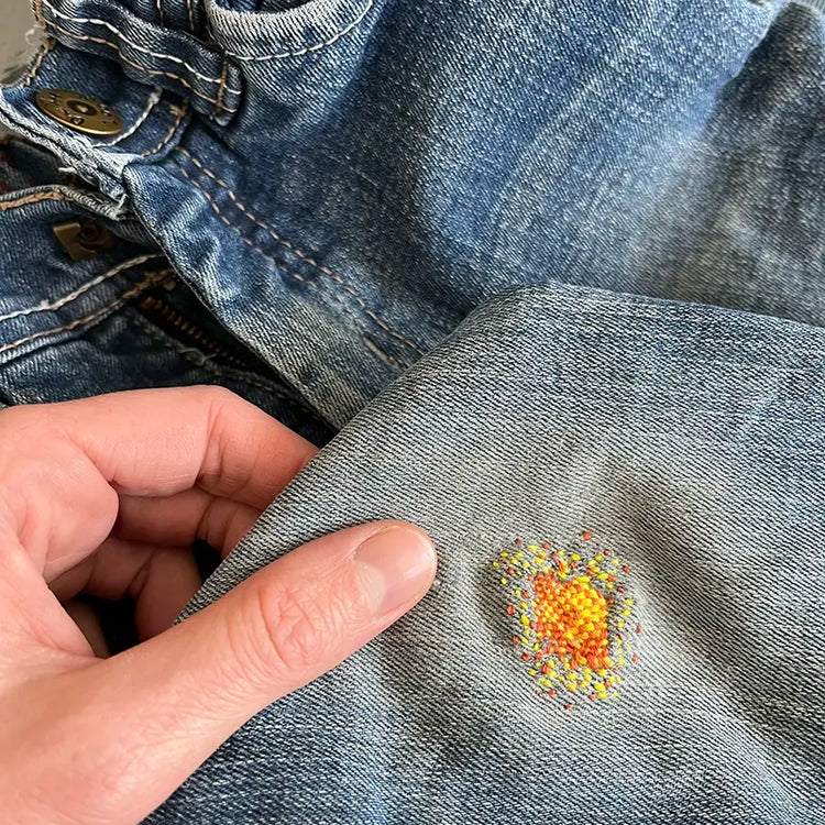 Je me suis alors lancé ce défi : repriser grâce à la broderie pour joindre l'utile à l'agréable en redonnant un peu de couleurs à ces pantalons troués.